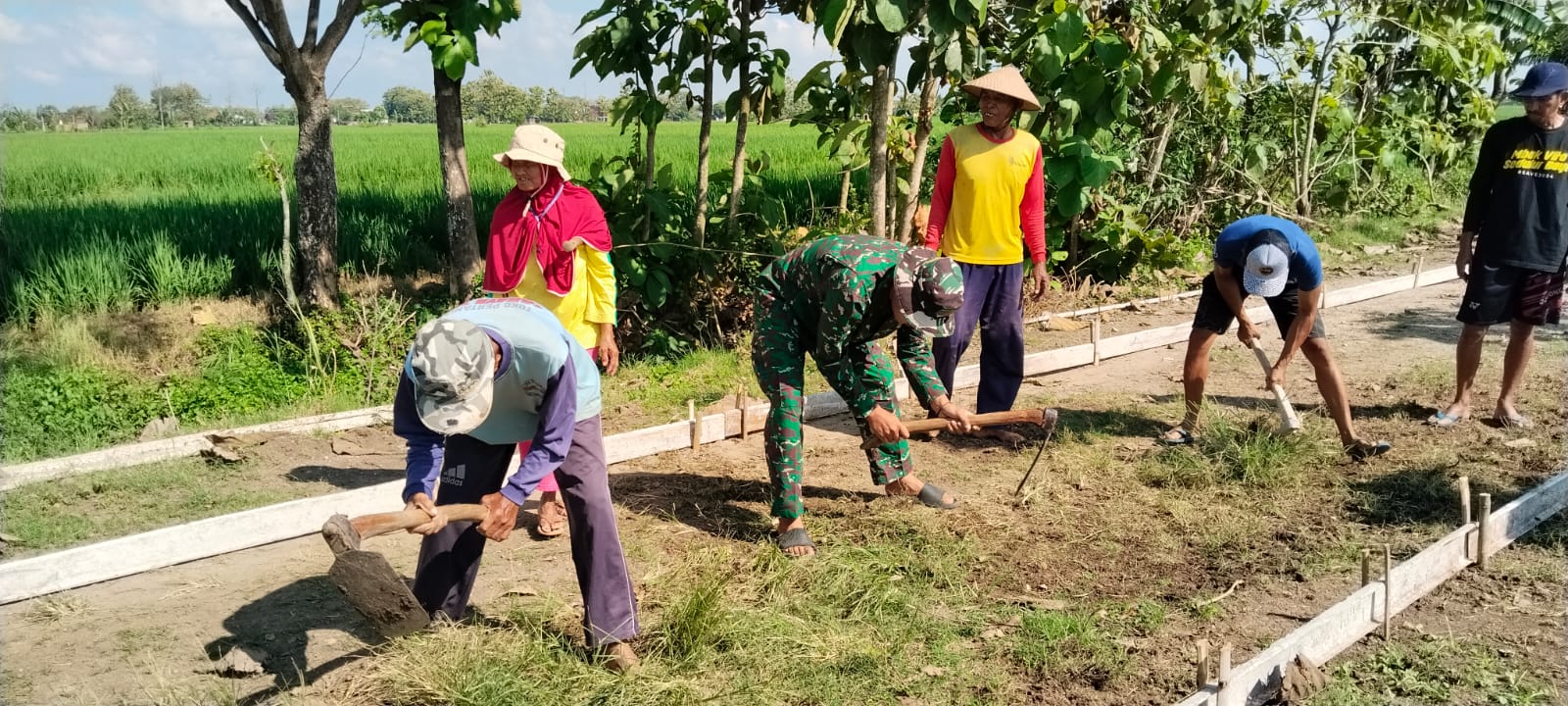 Perempuan yang sehari-hari berprofesi sebagai petani ini tampak tak canggung bergotong royong bersama warga dan anggota TNI. Dengan penuh semangat, ia ikut serta dalam proses pengecoran jalan yang menjadi salah satu sasaran utama program TMMD.