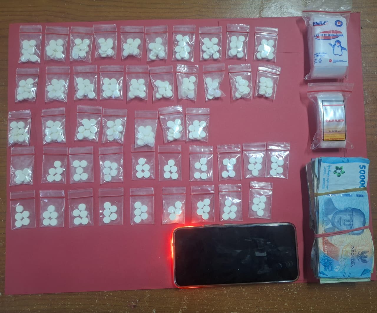 Adapun rincian barang bukti yang diamankan antara lain 74 butir Trihexyphenidyl 2 mg, 34 butir Tramadol, serta 365 butir pil Yarindo (pil sapi/pil koplo). Selain itu, turut diamankan uang tunai sebesar Rp1.366.000 yang diduga hasil penjualan, satu unit handphone, serta sejumlah plastik klip kosong yang digunakan untuk pengemasan.